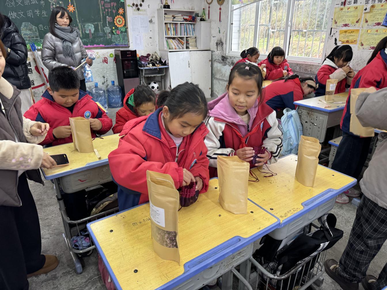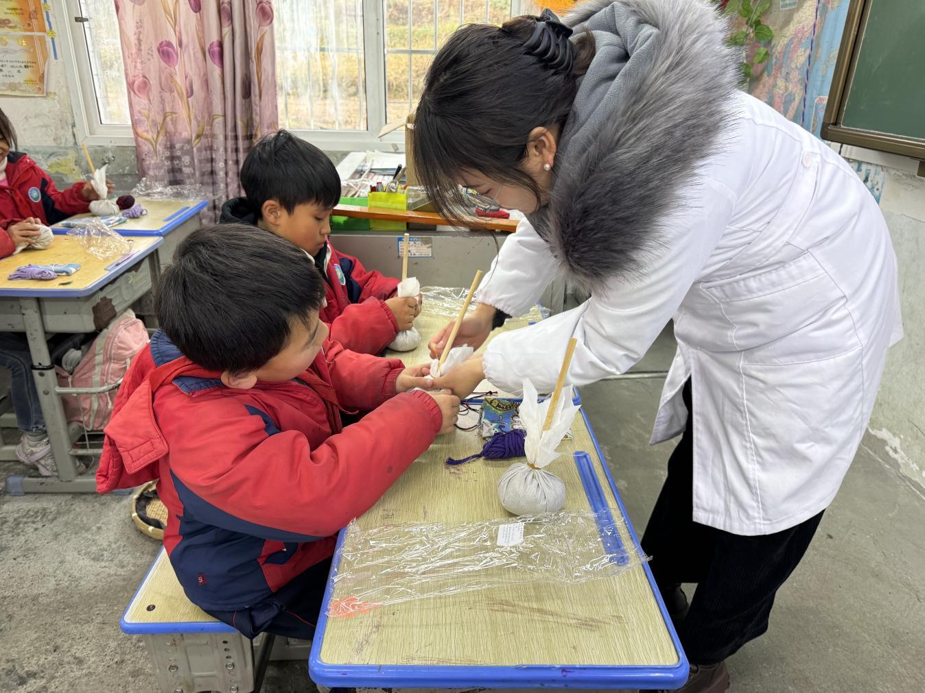 同行的党员教师代表到洗马镇哪嗙小学开展健康知识科普,带领孩子们制作中药香囊与艾草锤,在充满欢乐的教学氛围中,为孩子们打开中华优秀中医药文化之门。