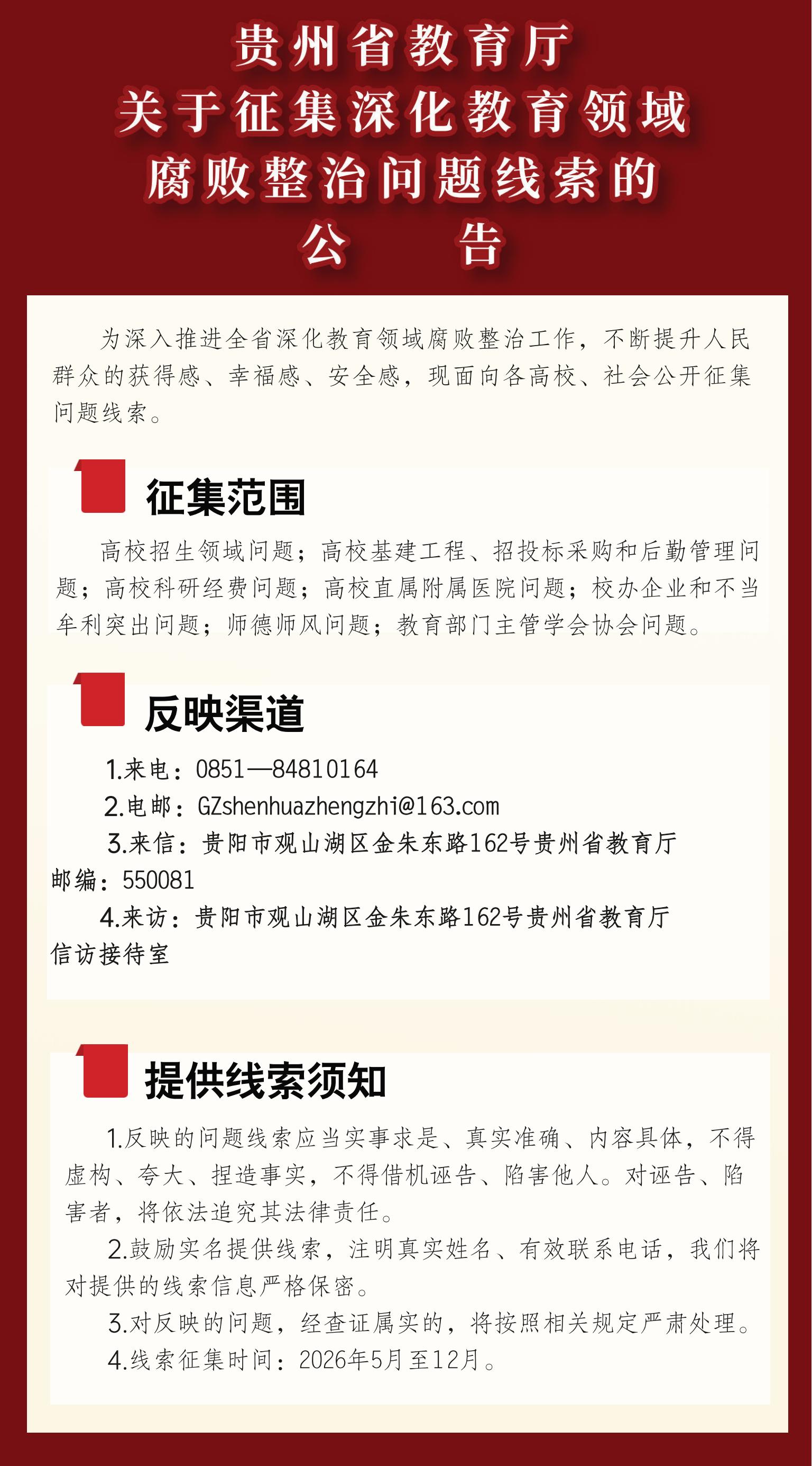 贵州省教育厅关于征集深化教育领域腐败整治问题线索的公告