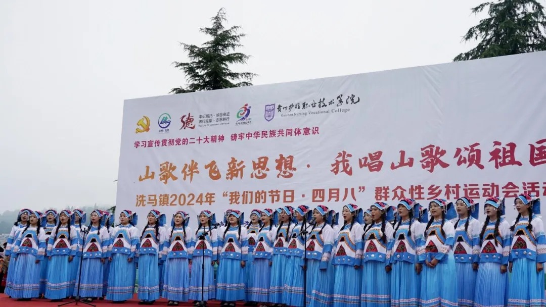天使花开展芳华,金秋送爽庆丰收——贵州护理职业技术学院助力贵定县乡村振兴文化活动 9月28日上午,金海雪山音寨演艺广场,阳光和煦,秋风送爽,丰收锣鼓随着缕缕桂香声声敲响。贵州护理职业技术学院一百多名学子