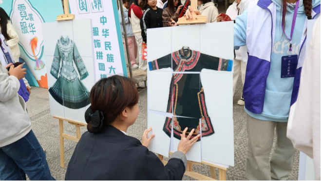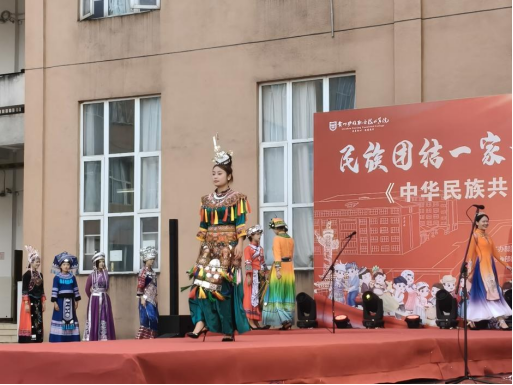 本次活动围绕“霓裳华服”“时空漫步”“风味中华”“诗韵流芳”“民族传统运动”五大主题区域展开,融合民族服饰、文物知识、传统美食、古典诗词、民族传统运动等特色元素,打造沉浸式、互动式的学习体验场景。在“霓裳华服”区,学生通过服饰拼图挑战,近距离感知苗绣技艺的匠心传承;“时空漫步”区则通过文物寻踪与知识问答,引导学生走进历史长河,理解中华民族共同体的深厚底蕴;“风味中华”区设置多民族美食摊位,学生在品尝与互动中体验“舌尖上的民族交融”;“诗韵流芳”区以诗词盲盒、飞花令擂台等形式,激发学生对中华诗词与少数民族诗歌的热爱与传承。