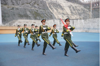 在庄严的升国旗仪式上,国旗护卫队昂首阔步出旗并升旗,伴随着威严的国歌,五星红旗缓缓升起,全体人员向国旗行注目礼。窗体底端