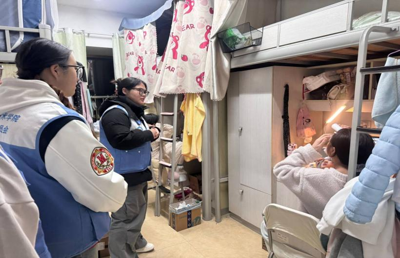 随行学生干部同步开展宿舍安全专项排查,全面检查内务卫生、用电规范等情况。针对插线板超负荷、违规电器存放等隐患,现场耐心劝导整改,强调用电安全红线,提醒大家“人走电断”,坚决杜绝火灾风险,筑牢宿舍安全防线。此外,“暖心管家”提醒同学们养成健康作息、维护宿舍卫生,共建温馨“宿舍小家”。