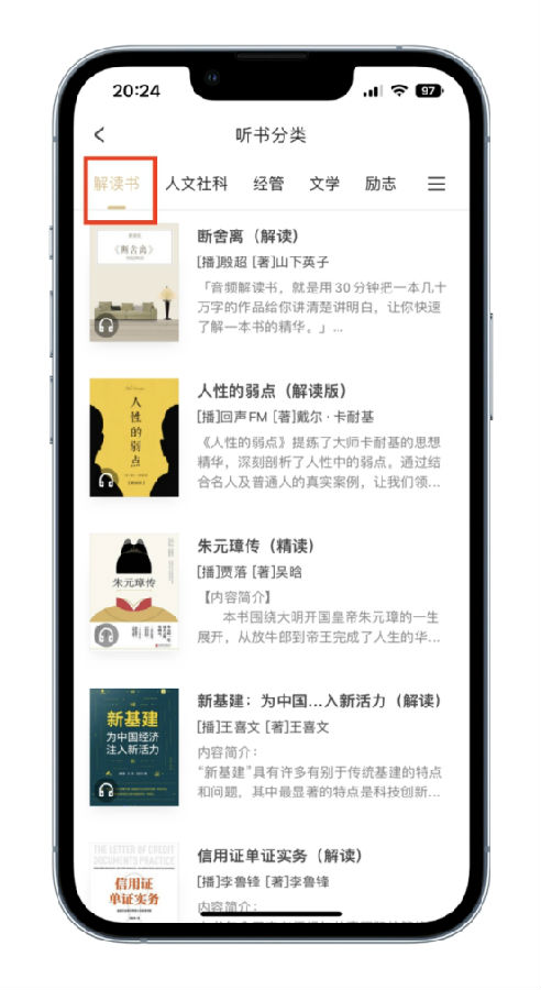 有声书资源其中包含了3000+集的大咖解读书,主要为经典书籍、重点书籍的解读,掌阅精选希望让读者在30分钟内掌握一本书的精华,帮助其将书中的知识运用到日常学习、生活中。