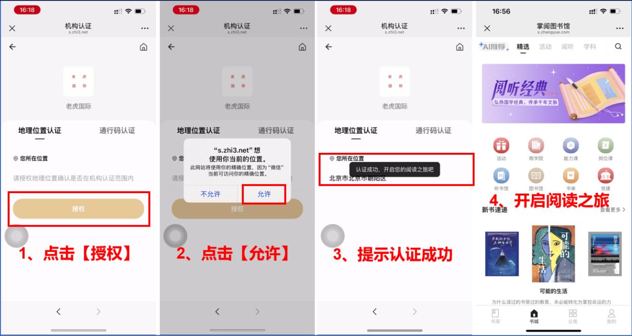 第三步:认证。打开定位,在校园范围内选择地理位置,认证点击【授权】,点击【允许】使用你当前的位置,点击“去设置”,填入个人信息,即可开启免费在线阅读。首次登录必须在校园IP范围内。