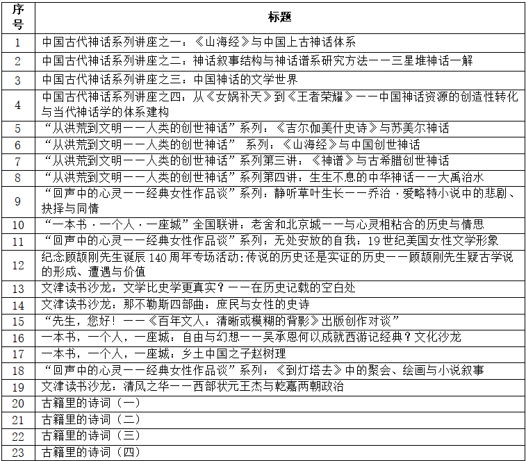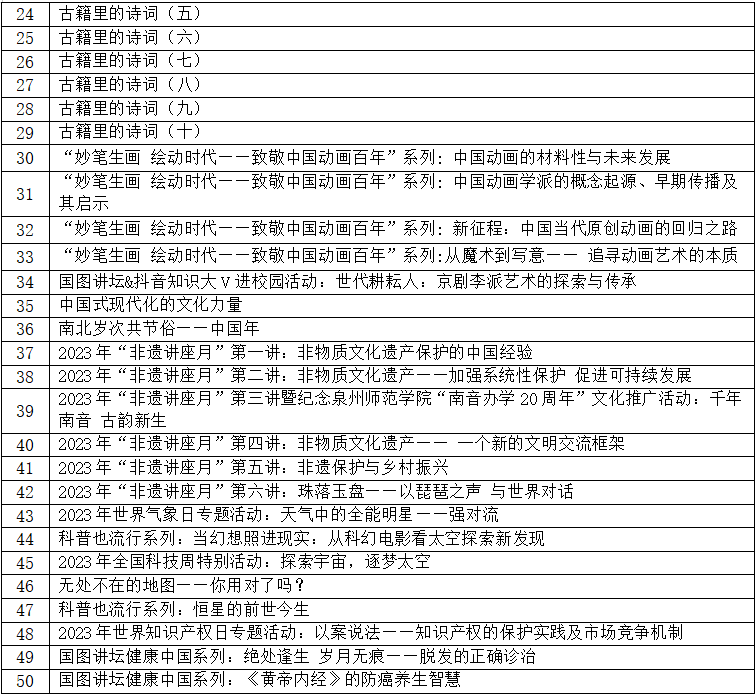 50场讲座资源可通过国家图书馆官网“音视频资源库”中文津讲坛、文津读书沙龙、国图讲坛等获得(链接:http://read.nlc.cn/specialResourse/yinshipinIndex),具体主题如表。